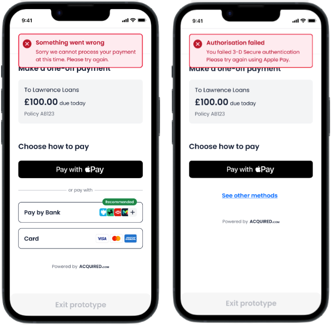 A transaction that fails with a recoverable reason will redirect the customer back to the payment page, and a temporary on-screen message will be displayed to guide their next attempt.
